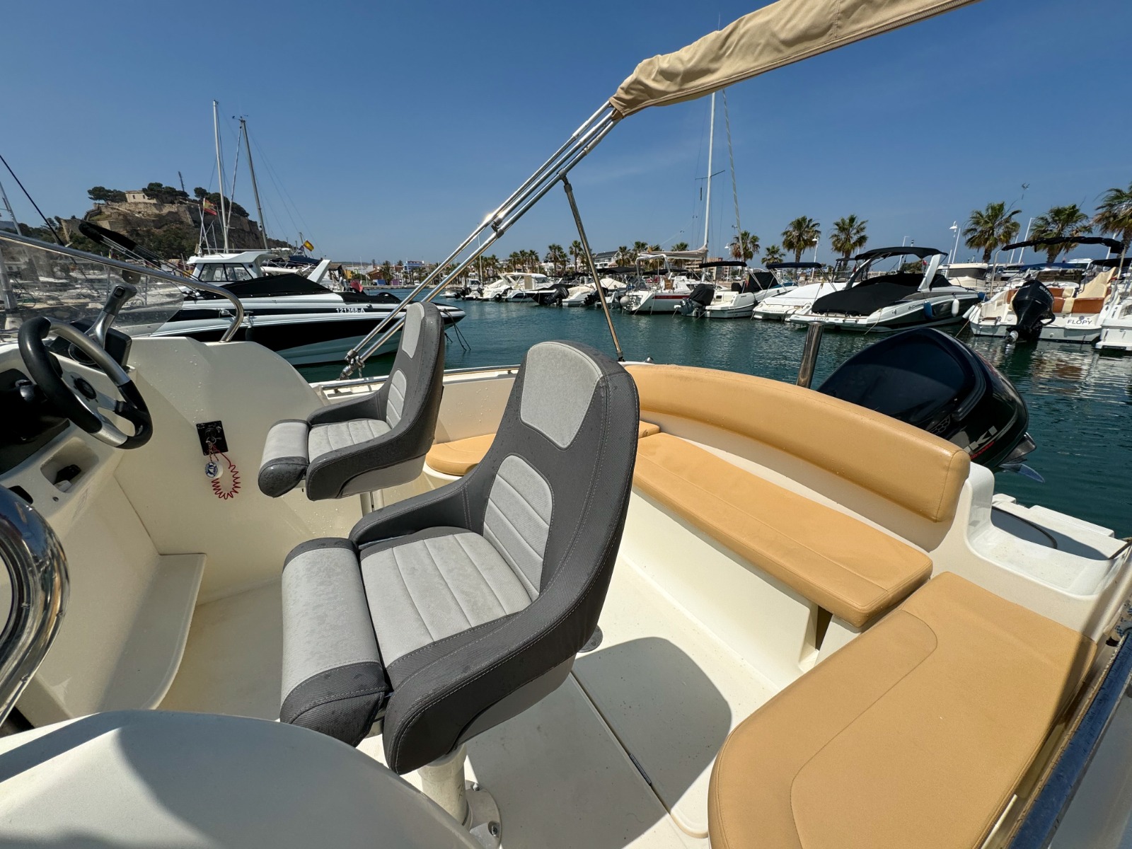 ALQUILER BARCO EN DENIA CON LICENCIA DE NAVEGACIÓN. Barco con eslora de 5 metros, con capacidad para 6 personas, equipada con motor SUZUKI DE 70 cv. Ideal para costear y ver nuestras playas de la Costa Blanca. Dispone de toldilla parasol, escalera de baño, solárium en proa, asiento transversal en popa. Combustible no incluido en el precio.