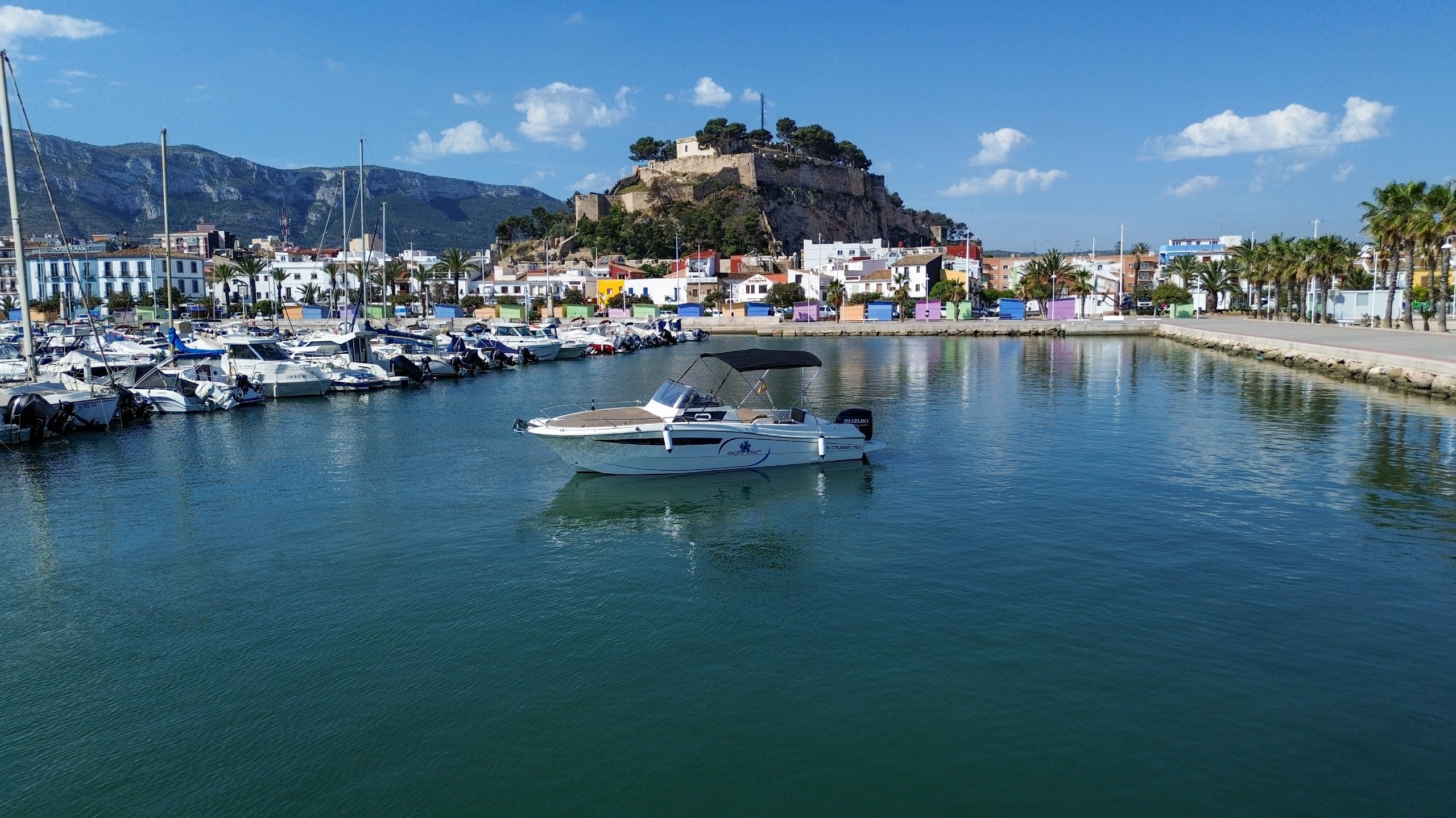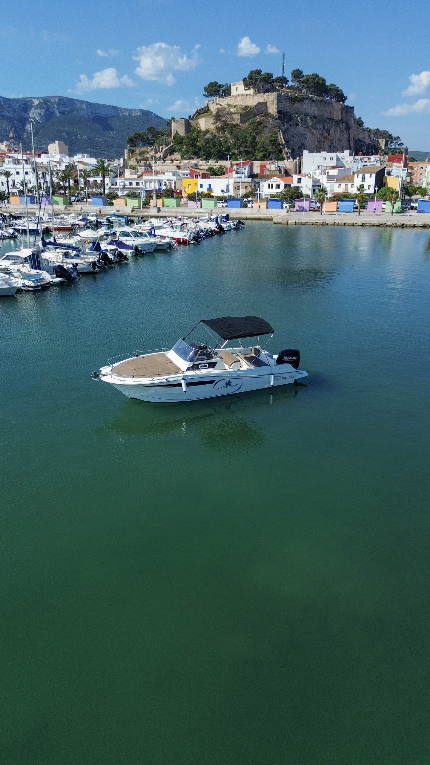 NOVEDAD 2021. Alquiler barcos en Dénia. Se PRECISA DE TITULO DE PATRÓN DE NAVEGACIÓN BÁSICA ( P.N.B ) para su manejo. ESTUPENDO BARCO PACIFIC CRAFT 750 SUNCRUISER equipada con motor SUZUKI SUZUKI de 225 cv. Amplia cabina equipada con baño marino y un confortable camarote. Solarium grande en proa, mesa desmontable, ducha de agua dulce, asientos laterales abatibles en popa, doble plataforma de baño con escalera, molinete de ancla eléctrico, radio VHF, equipo de música con Bluetooth y conexión USB. Con capacidad para 9 personas. Ideal para pasar el día por la Costa Blanca. Completamente equipada para proporcionarles mayor comodidad.
