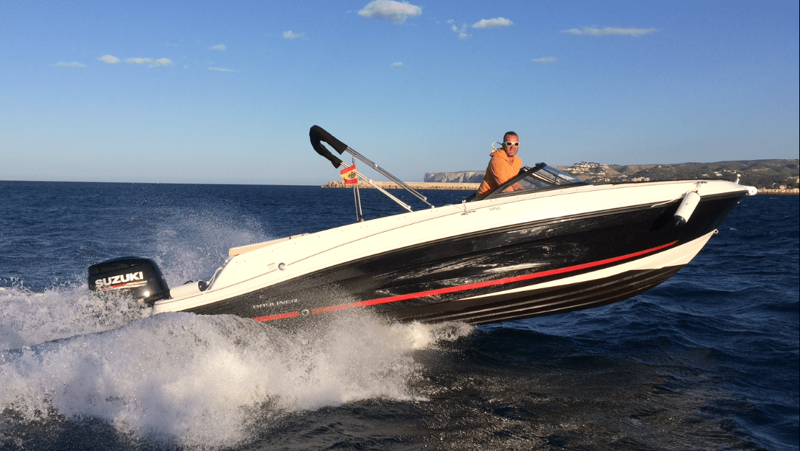 Alquiler barco Denia con título DE PATRÓN DE NAVEGACIÓN BÁSICA. Alquiler de barcos en Denia / Rent a boat in Denia. BAYLINER VR6 con eslora de 6,82 metros, equipada con motor Suzuki de 225 cv. toldo parasol, solarium desmontable en proa y fijo en popa, doble plataforma de baño con escalera, ducha de agua dulce, equipo de música con Bluetooth. Alquiler de barco con capacidad para 10 personas. Ideal para navegar por la costa de Denia y Jávea. Alquilamos barcos con patrón si no poseen del título náutico. Combustible no incluido.